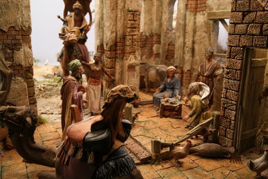 En efecto, allí está el artista, sentado en un taburete y con cara de haber pasado un camión por encima de él, pero dirigiendo atentamente la operación. Él no puede ni ponerse en pie, pero indica a sus acólitos dónde colocar cada pieza o cómo hacer que la cascada caiga en el punto previsto. Cada detalle es muy importante. Además, todos los años hay algo distinto: personajes nuevos, una cueva más para los pastores...